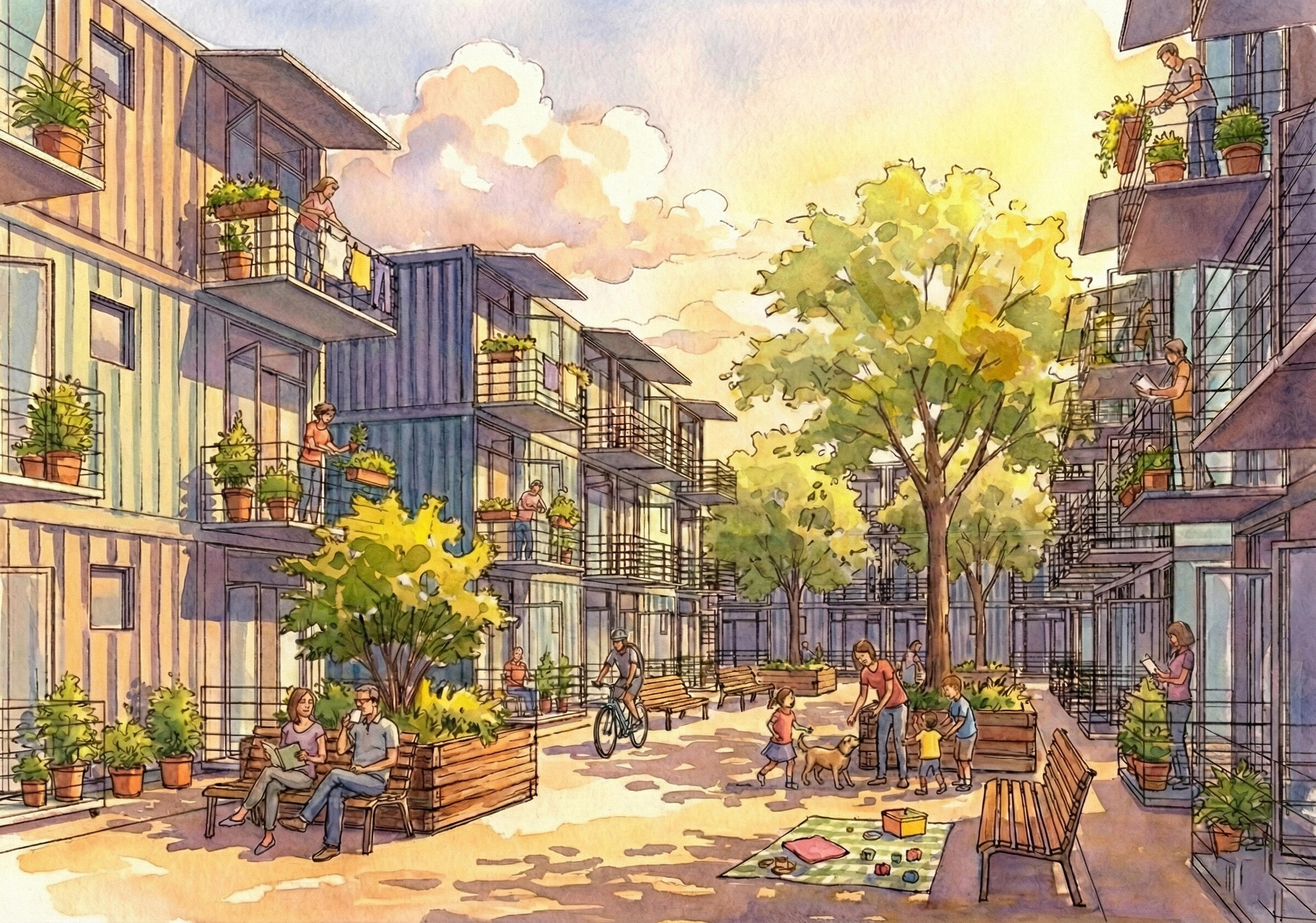 2. THE HARBOR MODEL (Urban Density) Best for: Transit corridors, industrial reuse, and underutilized urban land.The Harbor is a "Port of Call" in the recovery journey. These are permanent, 3-story modular walk-ups designed to provide "Protective Calm"—a sanctuary where residents can rest, resupply, and prepare for the next leg of their life.Scalable Density: Scaling to 60–100+ units while retaining the intimacy of a small community.Sanctuary Design: Architecture that prioritizes sound attenuation, private thresholds, and warm materials to ensure psychological safety.Unit Types: Stacked modular studios designed for high-efficiency footprints, built within the flow of the city to connect residents to jobs and transit.