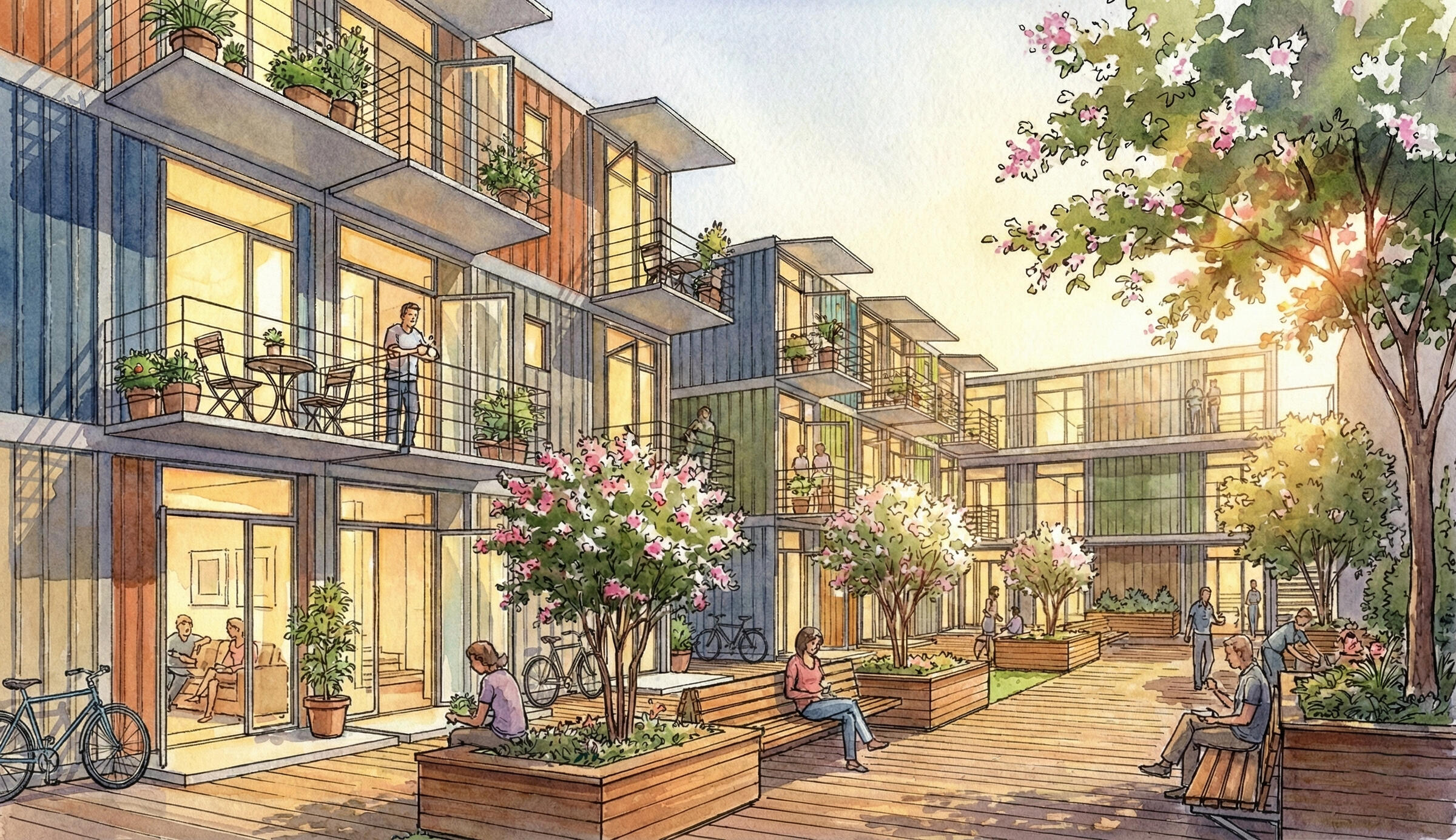 2. THE HARBOR MODEL (Urban Density) Best for: Transit corridors, industrial reuse, and underutilized urban land.The Harbor is a "Port of Call" in the recovery journey. These are permanent, 3-story modular walk-ups designed to provide "Protective Calm"—a sanctuary where residents can rest, resupply, and prepare for the next leg of their life.Scalable Density: Scaling to 60–100+ units while retaining the intimacy of a small community.Sanctuary Design: Architecture that prioritizes sound attenuation, private thresholds, and warm materials to ensure psychological safety.Unit Types: Stacked modular studios designed for high-efficiency footprints, built within the flow of the city to connect residents to jobs and transit.
